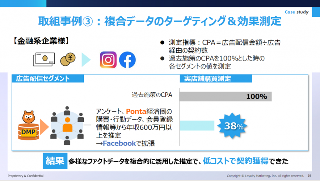 Ponta経済圏の購買・行動データと会員登録情報から年収600万以上のターゲットを推定。そこからFacebookで類似拡張を行い、広告を配信した結果が下の図です。過去施策のCPA (広告配信金額÷広告経由の契約数)に対してわずか38%という低コストでの契約獲得を実現しました。