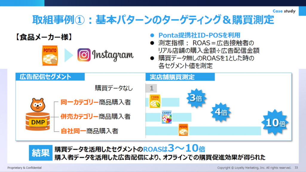 食品メーカーの購買データを使用した、広告のターゲティング配信と購買測定の事例です。