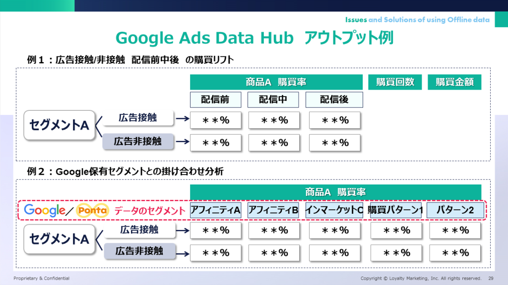 Google Ads Data Hubでは、各データの組合せを広告の配信後でも自由に設計できます。配信前に設定したセグメントで効果の差が表れなかった場合でも、配信後に差が出たセグメントを見つけ出すことが可能です。これは、広告の現場では非常に有効なアプローチになると考えられます。