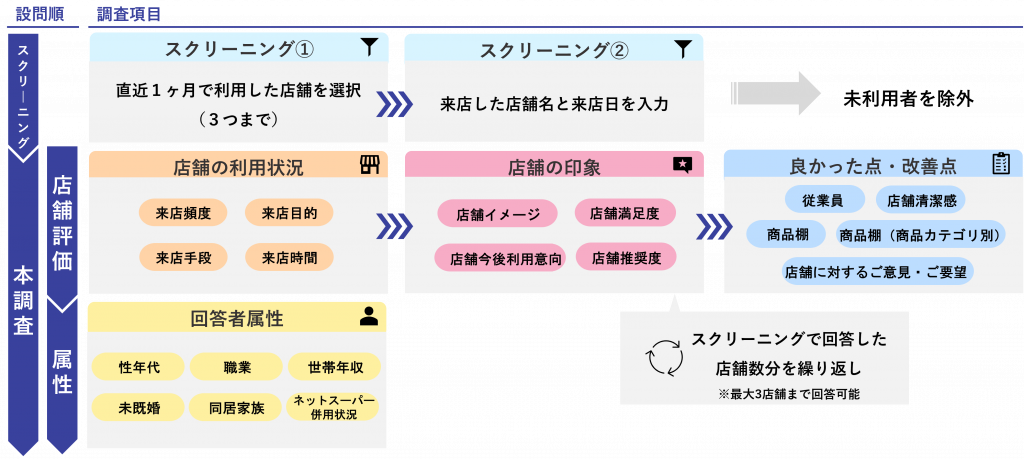 アンケート配信先を、自社・競合他社店舗の商圏にお住まいのPonta会員*に絞って指定することが可能です。回答者は、最初(スクリーニングパート)に利用店舗を最大3つまで選択、本調査パートで各店舗に対してそれぞれ「店舗の利用状況」「店舗の印象」「良かった点・改善点」について回答します。同時に回答者の属性情報も聴取するため、婚姻状況・家族構成等、さまざまな切り口からの分析が可能です。