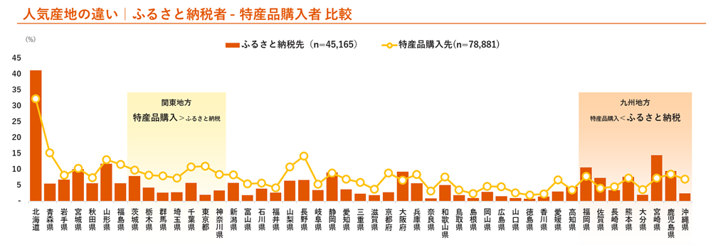 特産品・ふるさと納税ともに人気ランキング1位は「北海道」。関東地方は特産品購入、九州地方はふるさと納税利用が多い傾向