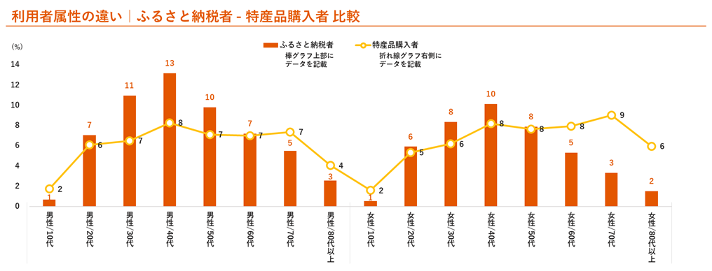 特産品購入者は、ふるさと納税利用者に対し、女性60代以上の割合が多い