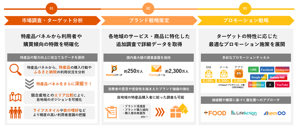 本サービスは、Pontaリサーチ会員約15万人を対象に聴取した特産品やふるさと納税に関する調査データです。自治体のニーズに応じて、LMがデータを活用して分析結果を提供します。自治体は、生活者の特産品の購入実態や産地認知度などのデータを基に、地域のブランド力を把握したり、特産品やふるさと納税の利用者の属性・ライフスタイルを捉えたりするなど、戦略立案に活用いただけます。また、深掘りしたい項目の追加調査の実施や、LMの有する多彩なメディアを利用したプロモーション施策のターゲティングなどにもご利用いただけます。