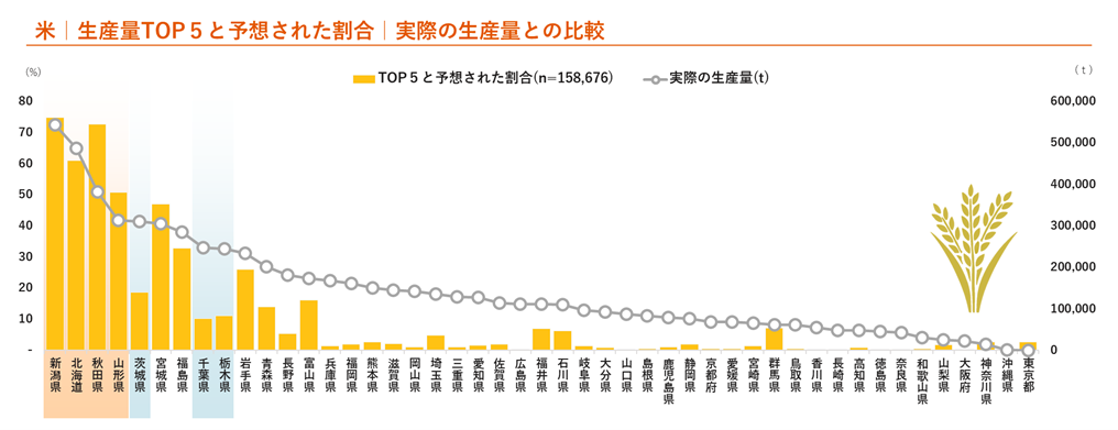 米の生産量TOP5と予想された都道府県は、1位「新潟県」。実際の生産量の多さに対して、予想割合が低い都道府県は、「茨城県」「千葉県」「栃木県」