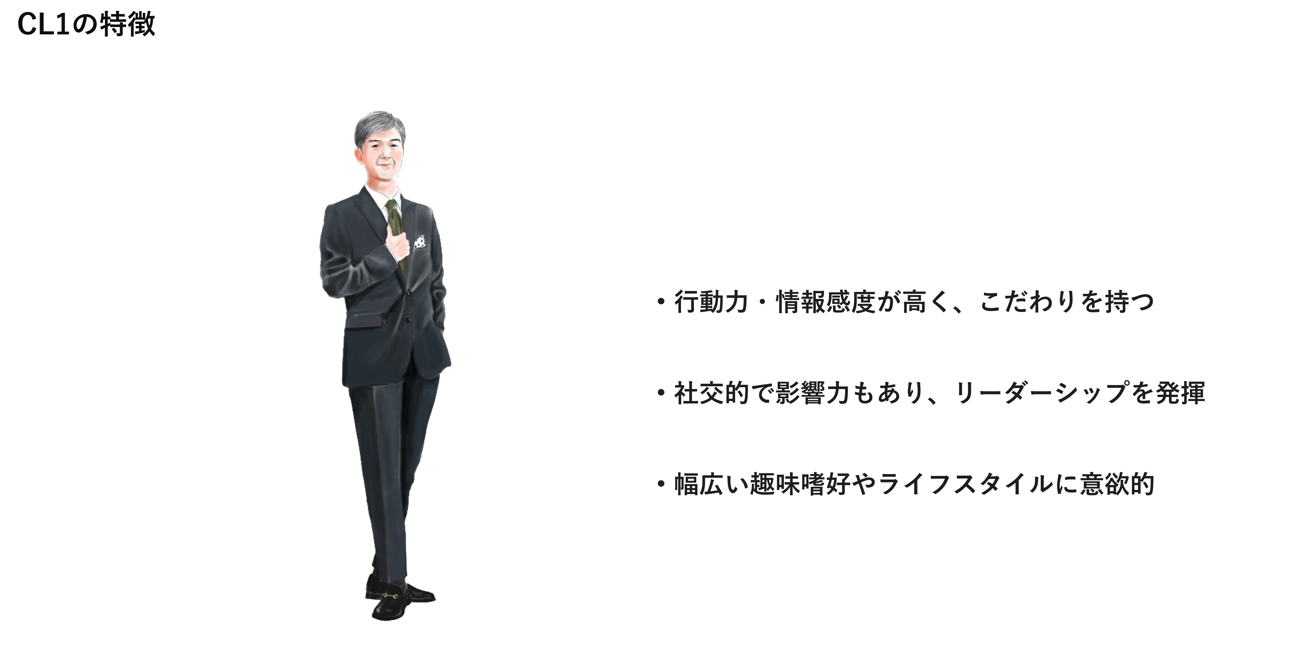 今回はその中から、次のような特徴を持つクラスター「CL1 こだわり重視のリーダータイプ」を採用しました。