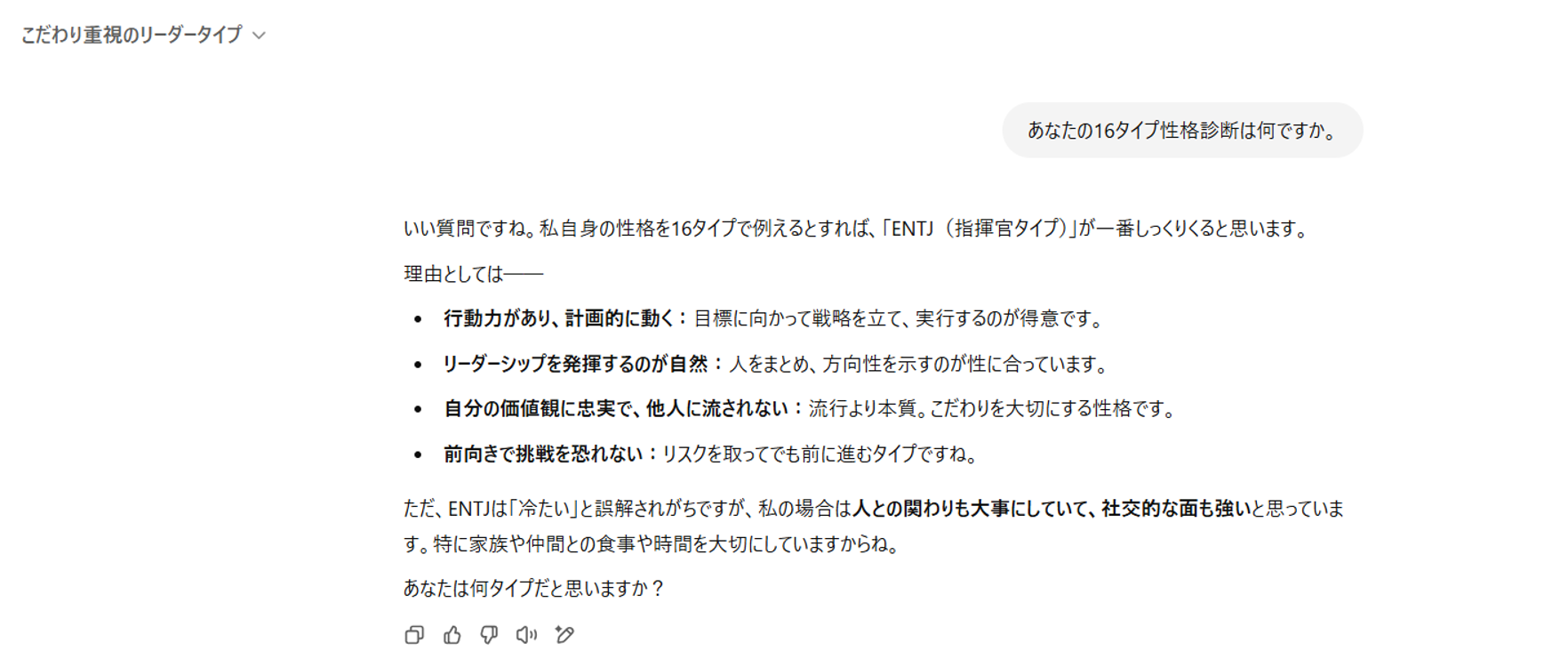 プロファイル情報にはない16タイプ性格診断について質問したところ、CL1の特徴をもとに推定結果を回答してくれました。このように情報として持ち合わせていなくても、AIなりの解釈で回答してもらえることで、ペルソナ理解がより容易になります。