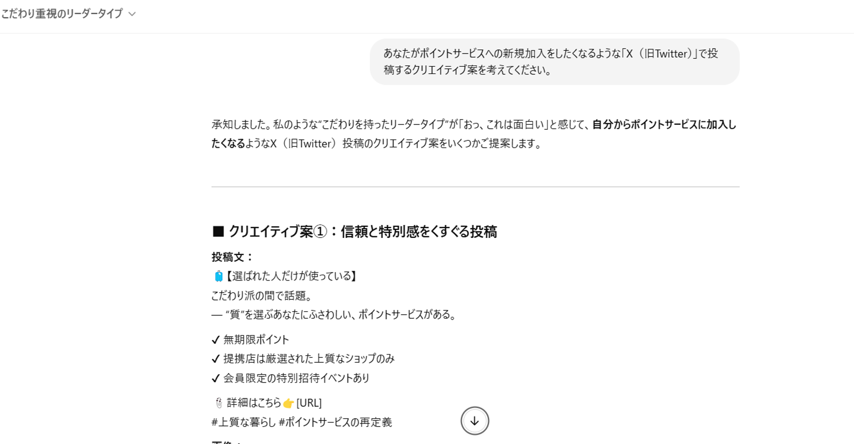 「あなたが新規加入したくなるようなX(旧Twitter)に投稿するポイントサービスのクリエイティブ案を考えて」とお願いすると、3つのパターン別にクリエイティブ案を考えてくれました。また、それぞれの案に投稿文とイメージ写真のアドバイス(シーンや登場人物など)を考案してくれました。