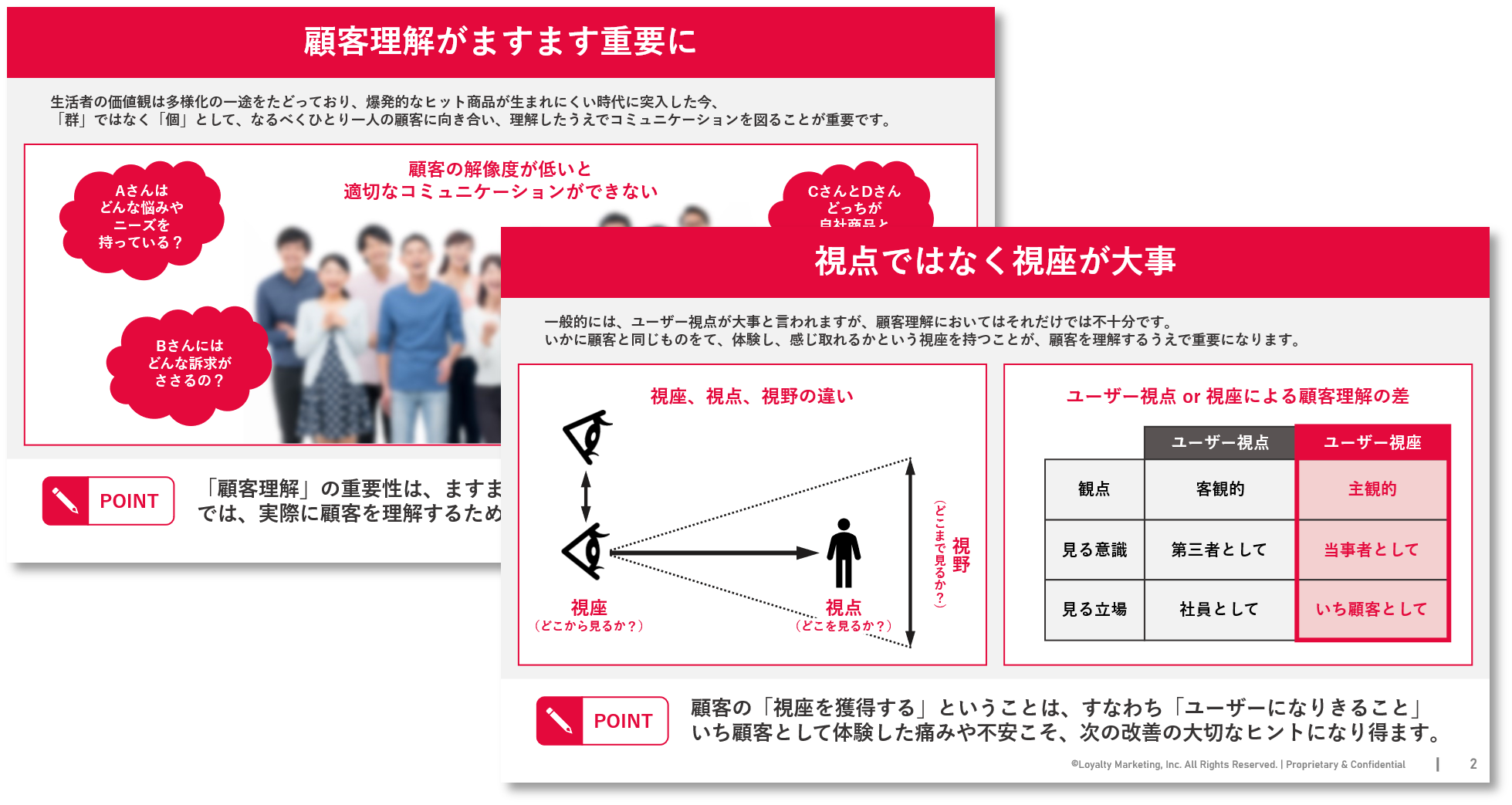 近年、生活者の価値観が多様化する中で、「顧客理解」の重要性が高まっています。「顧客のことを考えているつもりなのに、施策が響かない」と感じたことはありませんか?その背景には、“ユーザー視点”にとどまっていては捉えきれない、生活者の本音や行動の複雑さがあります。 ロイヤリティ マーケティングでは、顧客理解の原点に立ち返り、「視点」「視座」「視野」の違いや、仮説構築から検証までのプロセスを整理したお役立ち資料『顧客の視座を獲得しよう』を制作しました。ぜひダウンロードしてご活用ください。