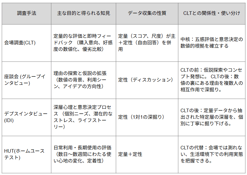 会場調査(CLT)の内容・目的・特長マトリックス
