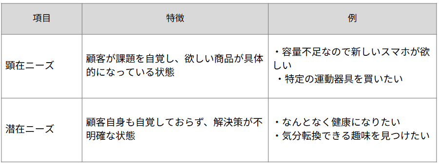 顧客のニーズは、本人がすでに自覚している「顕在ニーズ」と、本人もまだ気づいていない「潜在ニーズ」の2種類に大別されます。それぞれの違いを以下にまとめました。