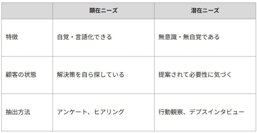 顧客ニーズには、本人がはっきりと自覚している「顕在ニーズ」と、無意識下の「潜在ニーズ」という2つの階層があります。