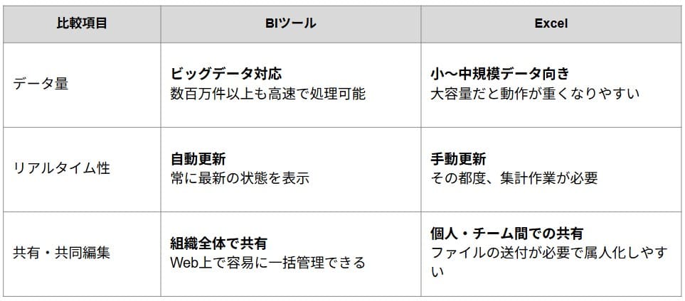 BIツールとExcelの主な違いは、扱えるデータ量と共有の利便性にあります。