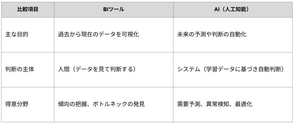 BIツールは「現状の把握」を、AIは「未来の予測」を主な目的とする点に違いがあります。
