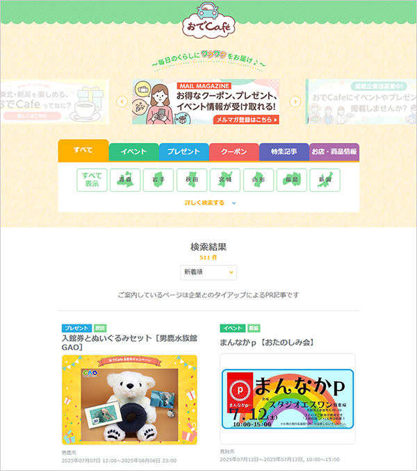 平野様:「おでCafe」は、東北6県と新潟県のおでかけ情報サイトです。地域に精通した東北電力社員が、各エリア内のイベントやお店のご紹介、クーポンなどを発信しています。特に人気なのが、地元企業のおすすめ商品・サービスが抽選であたるプレゼント企画です。