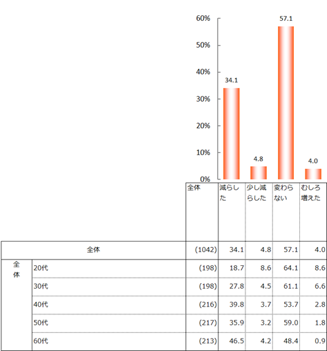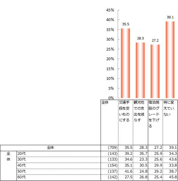 また、宿泊施設の選び方については「変わらない」が57.3%となり、次いで「格安ホテルを選ぶようになった」が38.4%だった。