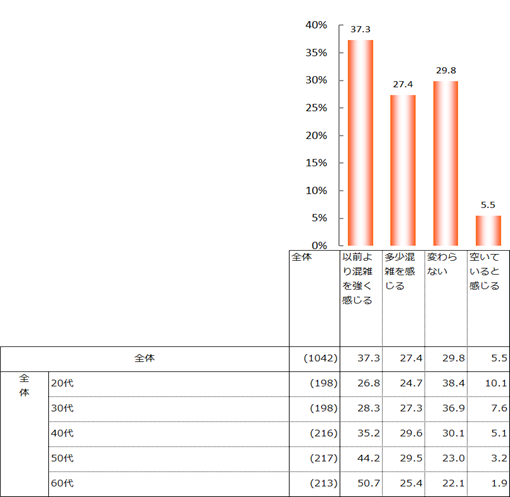 インバウンドの増加によって、観光地の混雑を感じるか伺ったところ、「以前より混雑を強く感じる」が全体の37.3%、「多少混雑を感じる」が27.4%となり、合わせると64.7%だった。