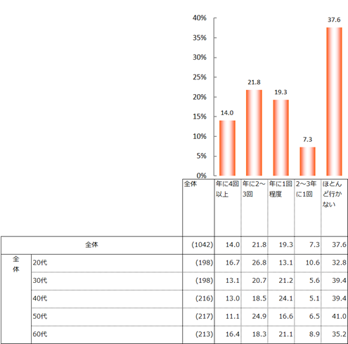 近年(過去3年間)における国内旅行の頻度は「ほとんど行かない」が37.6%だった。「年に4回以上」が14.0%、「年に2~3回」が21.8%、「年に1回程度」が19.3%となり、合わせると55.1%だった。過半数が年1回以上、国内旅行をしている。