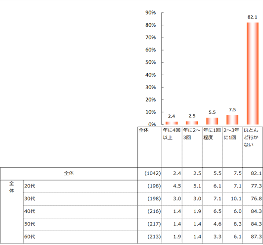 一方、海外旅行は「ほとんど行かない」が82.1%と突出している。年代別で見ても、全ての年代で7割以上を占めた。