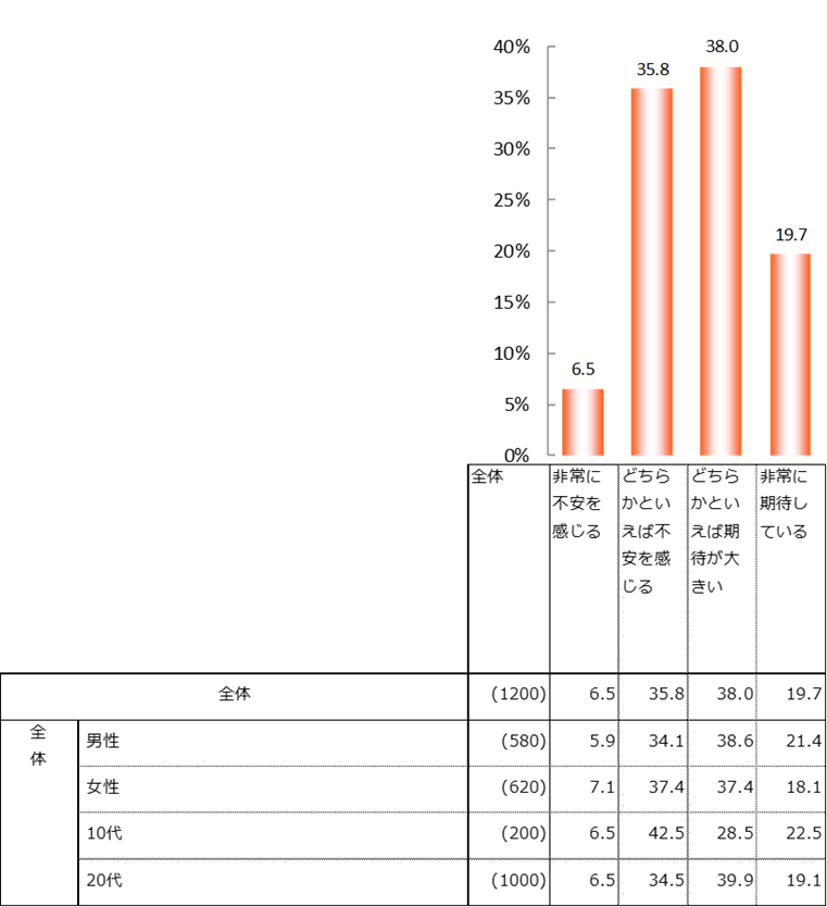 テクノロジーの発展に対して、「どちらかといえば期待が大きい」が全体の38.0%でトップ、次いで「どちらかといえば不安を感じる」が35.8%、「非常に期待している」が19.7%となった。期待する層は57.7%となり、不安を感じる層(42.3%)を上回った。