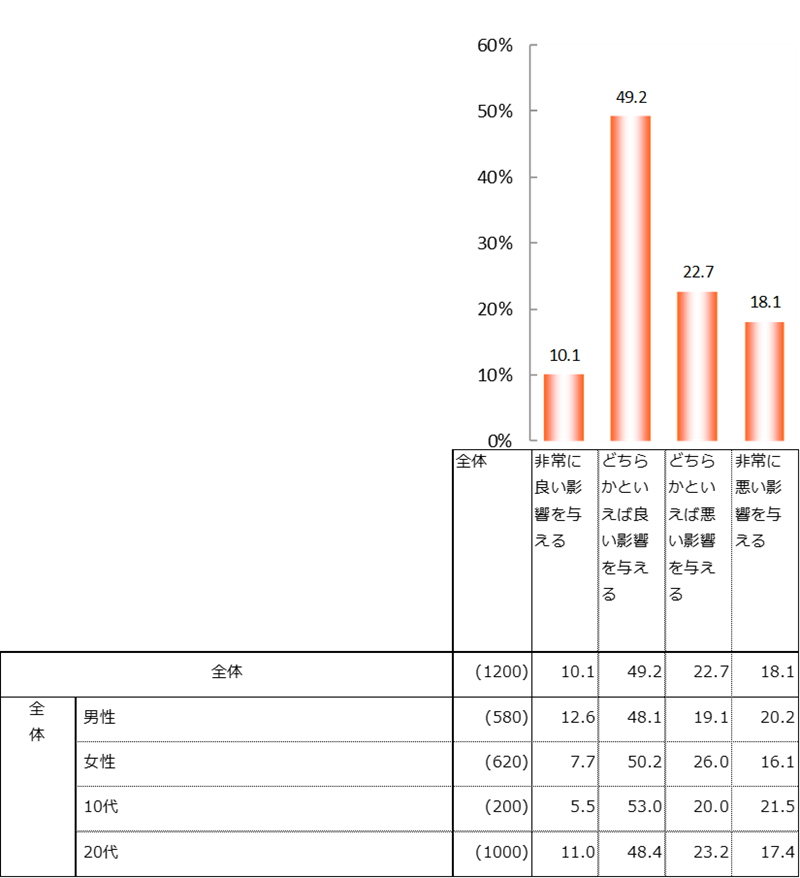 また、AIが今後の社会に与える影響について、「どちらかといえば良い影響を与える」が全体の49.2%で約半数を占めた。「非常に良い影響を与える」(10.1%)と合わせると59.3%となり、肯定的に捉える人の方が多かった。