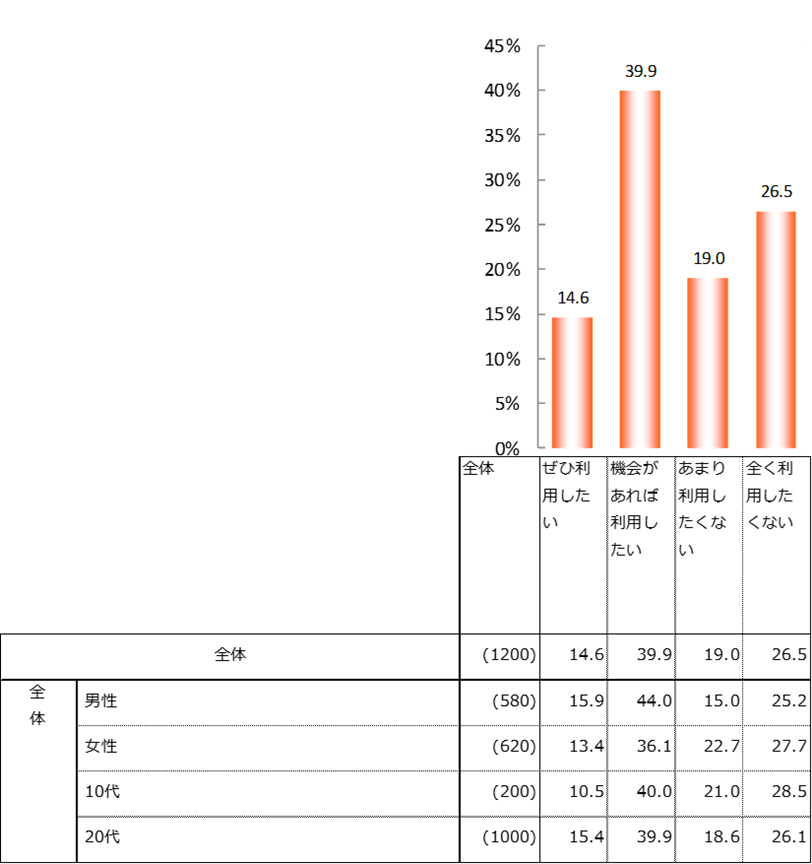 空飛ぶクルマや自動運転車などのモビリティ技術を「機会があれば利用したい」が全体の約4割