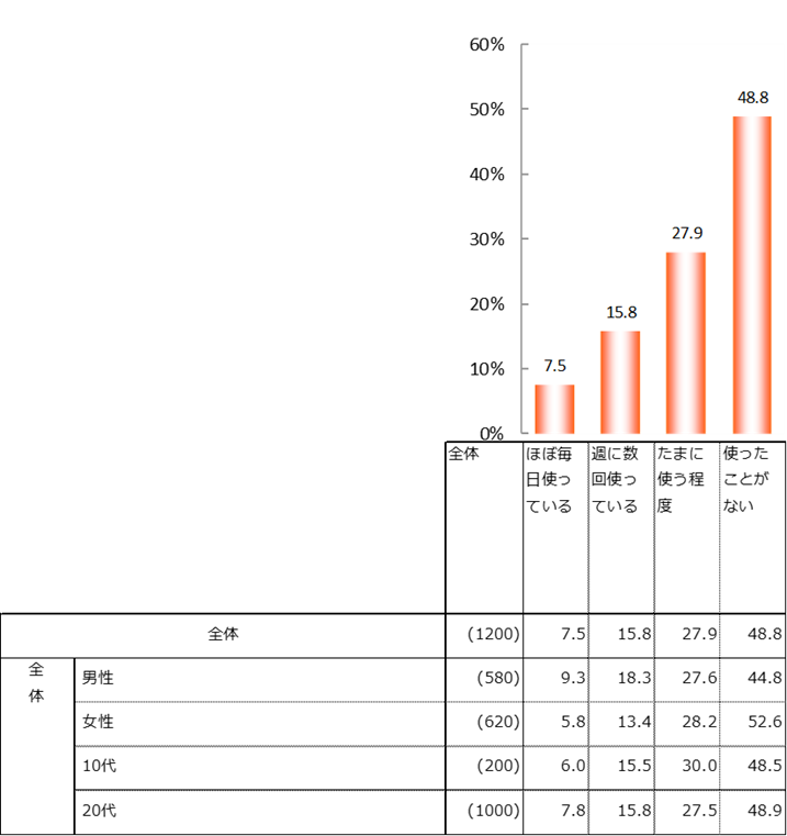 生成AI(ChatGPT、画像生成AIなど)の使用頻度について、「ほぼ毎日使っている」(7.5%)、「週に数回使っている」(15.8%)、「たまに使う程度」(27.9%)の合計が過半数を占めた。Z世代の2人に1人が生成AIを使用していることが分かった。「使ったことがない」が全体の48.8%だった。