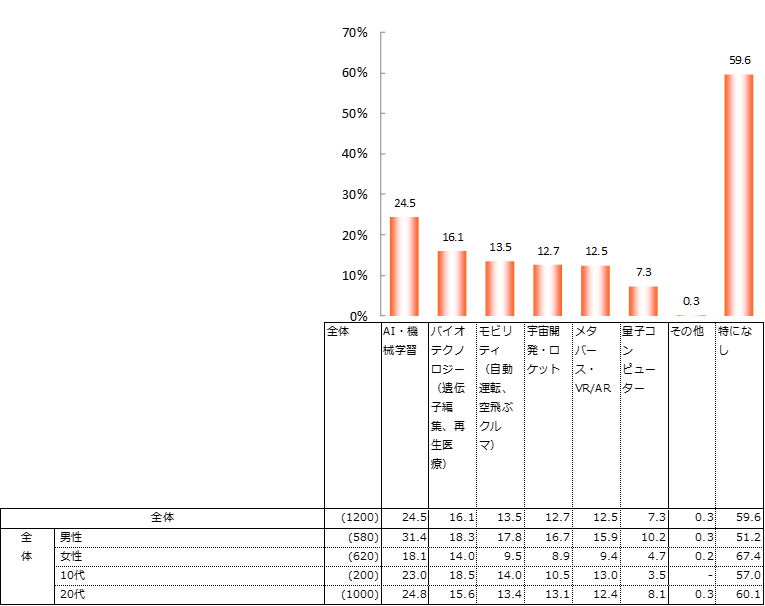 また、興味がある最先端技術の分野を伺ったところ、「特になし」が全体の約6割を占めた。「AI・機械学習」が全体で24.5%、性別では男性が31.4%となり、女性(18.1%)よりも13.3ポイント高い。