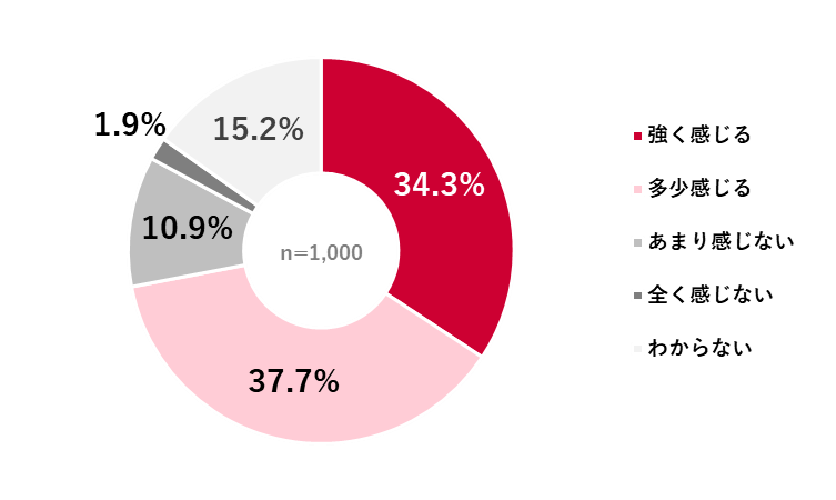 トランプ関税によって物価が上がると感じるか伺ったところ、「強く感じる」(34.3%)、「多少感じる」(37.7%)を合わせると72.0%だった。