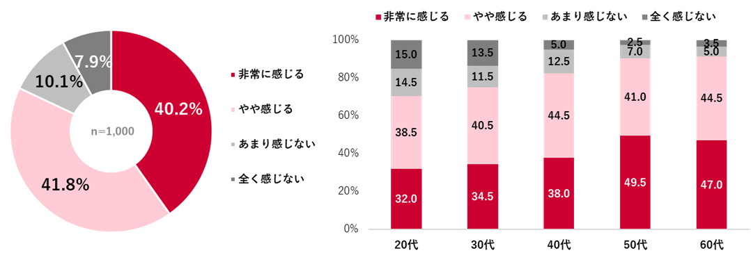 また、今後の日本経済への不安について「非常に感じる」(40.2%)、「やや感じる」(41.8%)を合わせた「不安を感じる層」は82.0%を占めた。年代別で見ると、50代と60代では「不安を感じる層」が9割を超える。