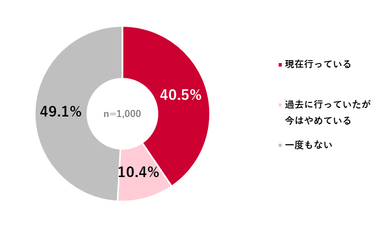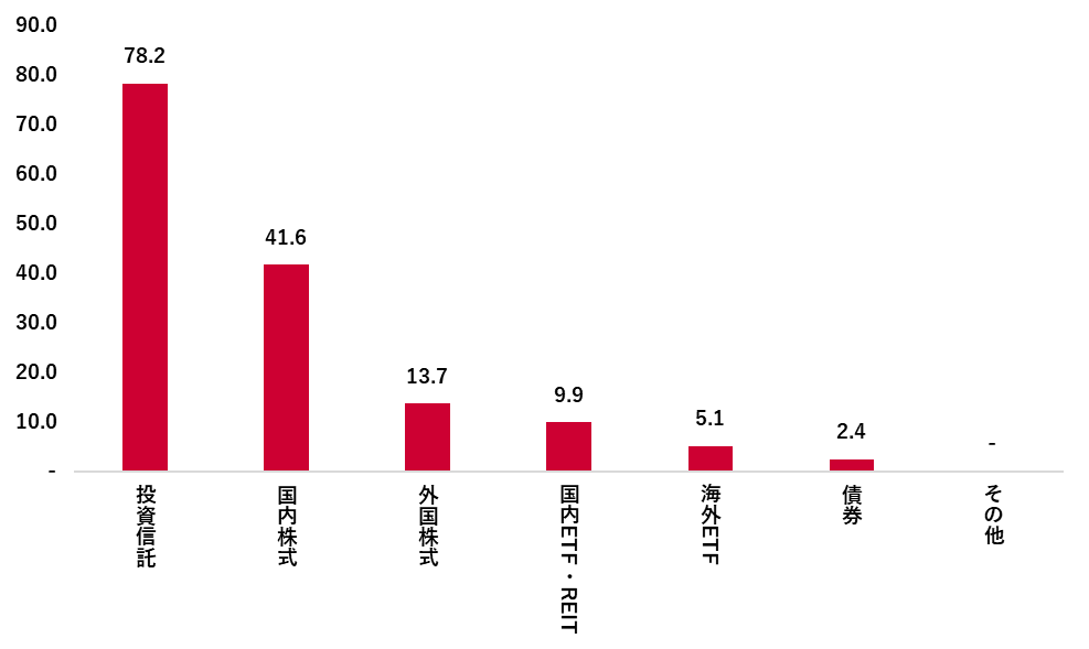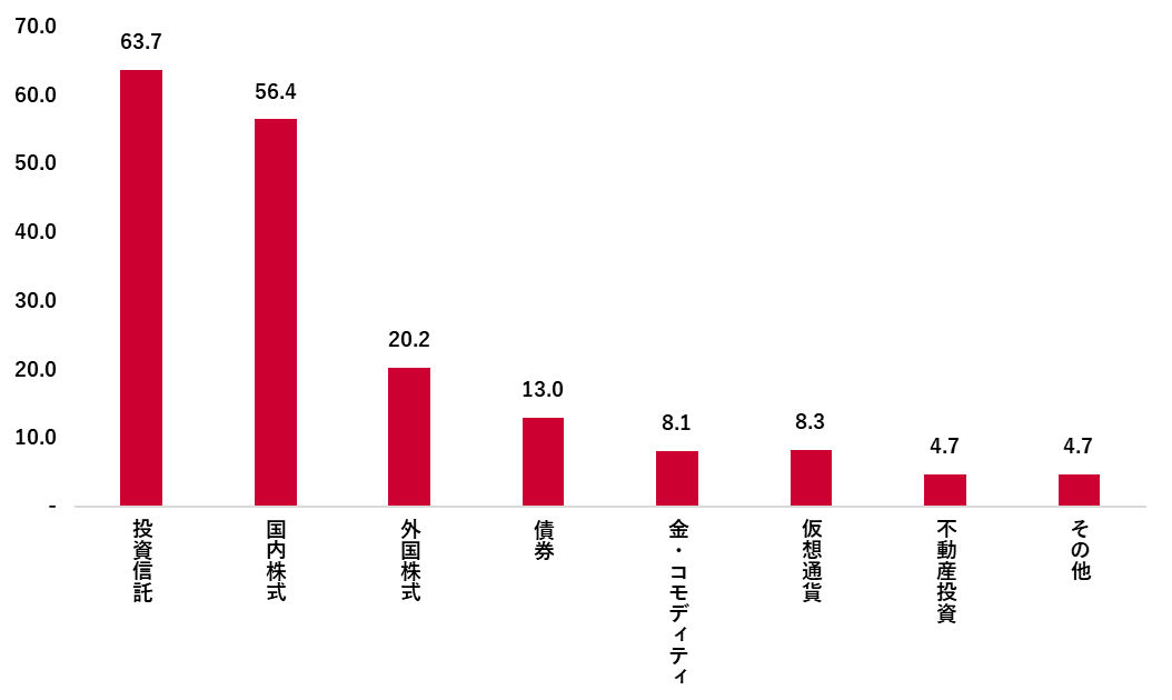 また、何らかの投資や資産運用を行った経験について、「現在行っている」が約4割、「過去に行っていたが今はやめている」が約1割となり、「一度もない」が約半数を占めた。経験者の投資対象は「投資信託」が63.7%、「国内株式」が56.4%で上位だった。