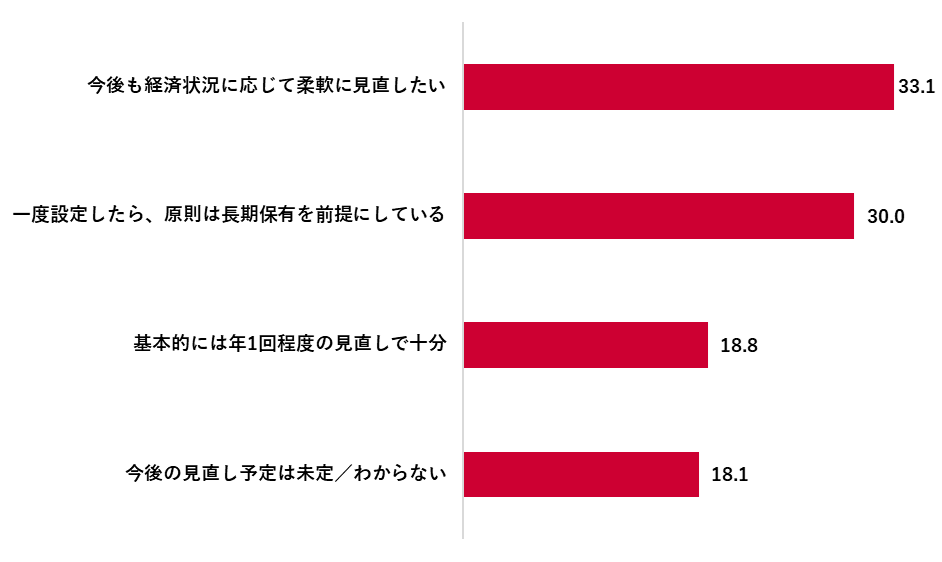 新NISAの今後の投資方針については、「今後も経済状況に応じて柔軟に見直したい」が33.1%、「一度設定したら、原則は長期保有を前提にしている」が30.0%で拮抗した。次いで「基本的には年1回程度の見直しで十分」が18.8%だった。