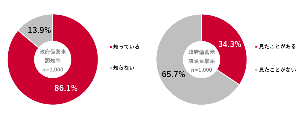 政府備蓄米の一般販売について「知っている」と回答した人は86.1%と高い認知率となった。しかし、実際に店頭で販売されているのを「見たことがある」と答えた人は34.3%にとどまった。