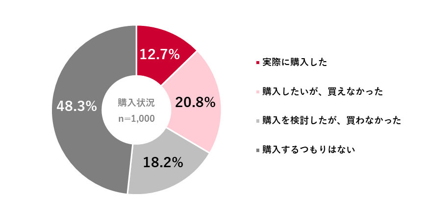 政府が今年放出した備蓄米の購入状況を尋ねたところ、「実際に購入した」は12.7%だった。一方で、「購入するつもりはない」が48.3%と約半数を占めている。