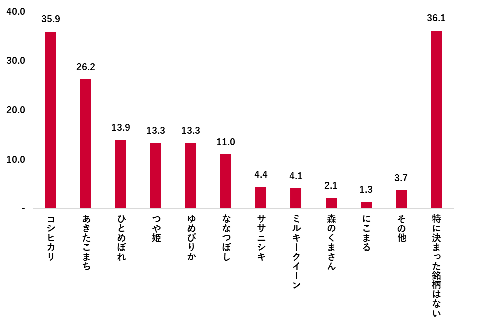 普段食べている銘柄については、「特に決まった銘柄はない」が36.1%と最多だった。具体的な銘柄では「コシヒカリ」35.9%、「あきたこまち」26.2%が上位となった。