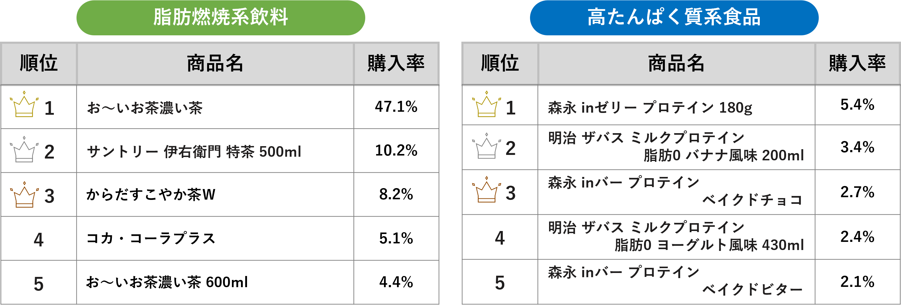 脂肪燃焼系の購入率第1位は「お~いお茶濃い茶」、高たんぱく質系では「森永 inゼリー プロテイン」。