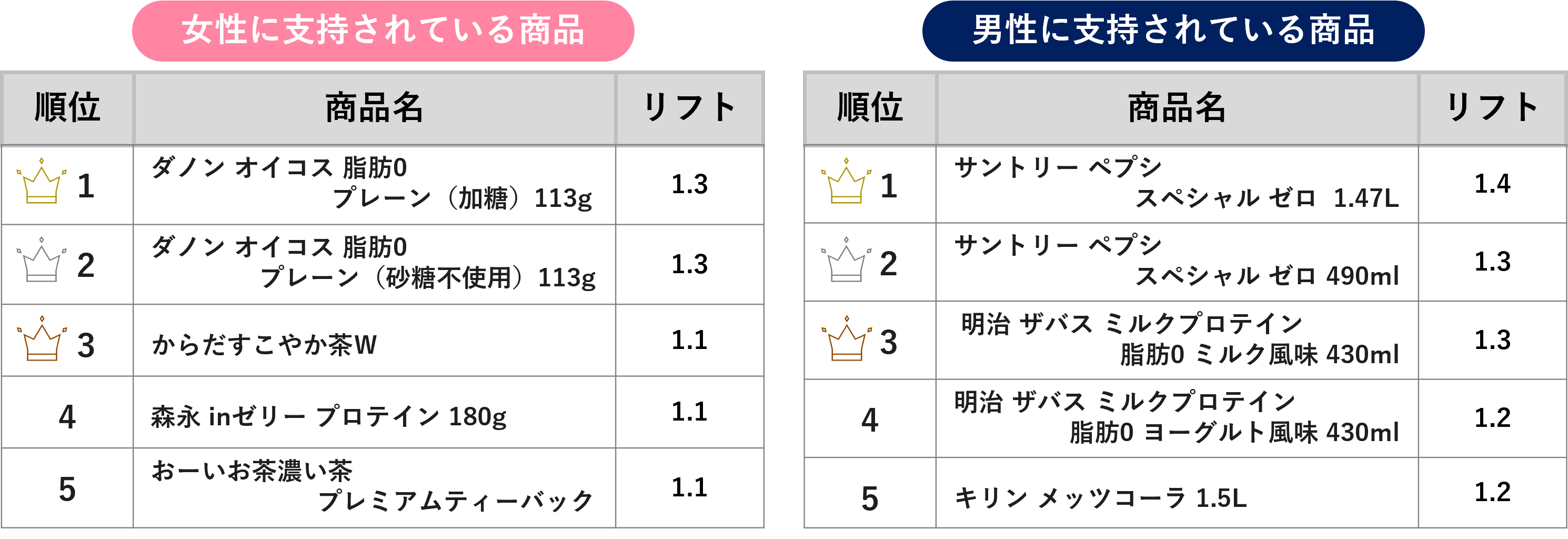 女性に支持されている商品として、ダノン オイコス 脂肪0 プレーン(加糖/砂糖不使用)がともにリフト1.3でトップに。続く「からだすこやか茶W」「森永 inゼリー プロテイン」「おーいお茶 濃い茶 プレミアムティーバック」もリフト1.1と高く、ヨーグルト系や高カテキン茶、プロテインゼリーなど、美容や日常的な体調管理を意識したラインナップが目立ちます。