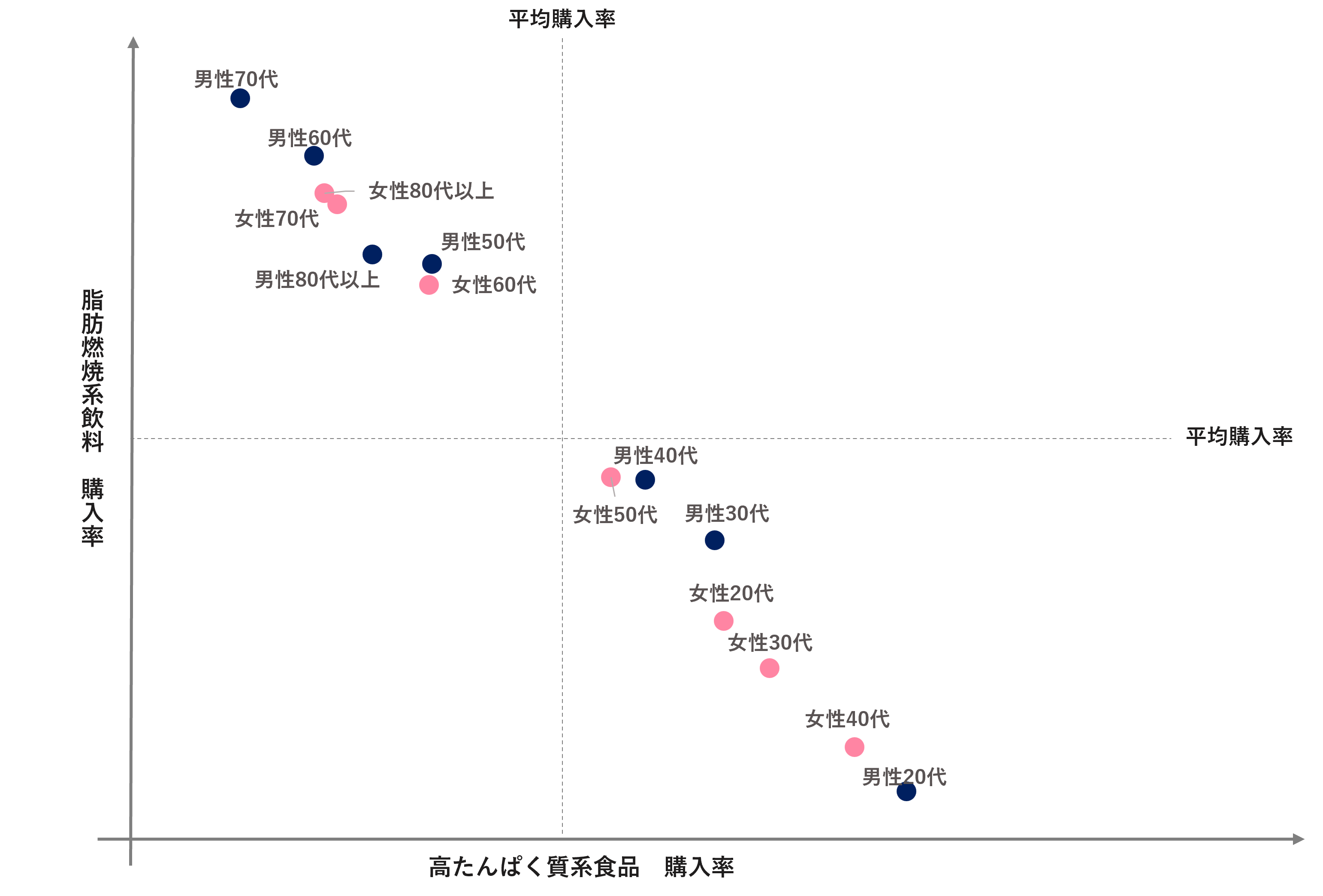 最後に、「脂肪燃焼系飲料」と「高たんぱく質系食品」それぞれの購入率を、性別×年代別に比較しました。 横軸を高たんぱく質系食品の購入率、縦軸を脂肪燃焼系飲料の購入率とした散布図を作成し、性年代ごとの健康志向タイプを視覚的に表しています。