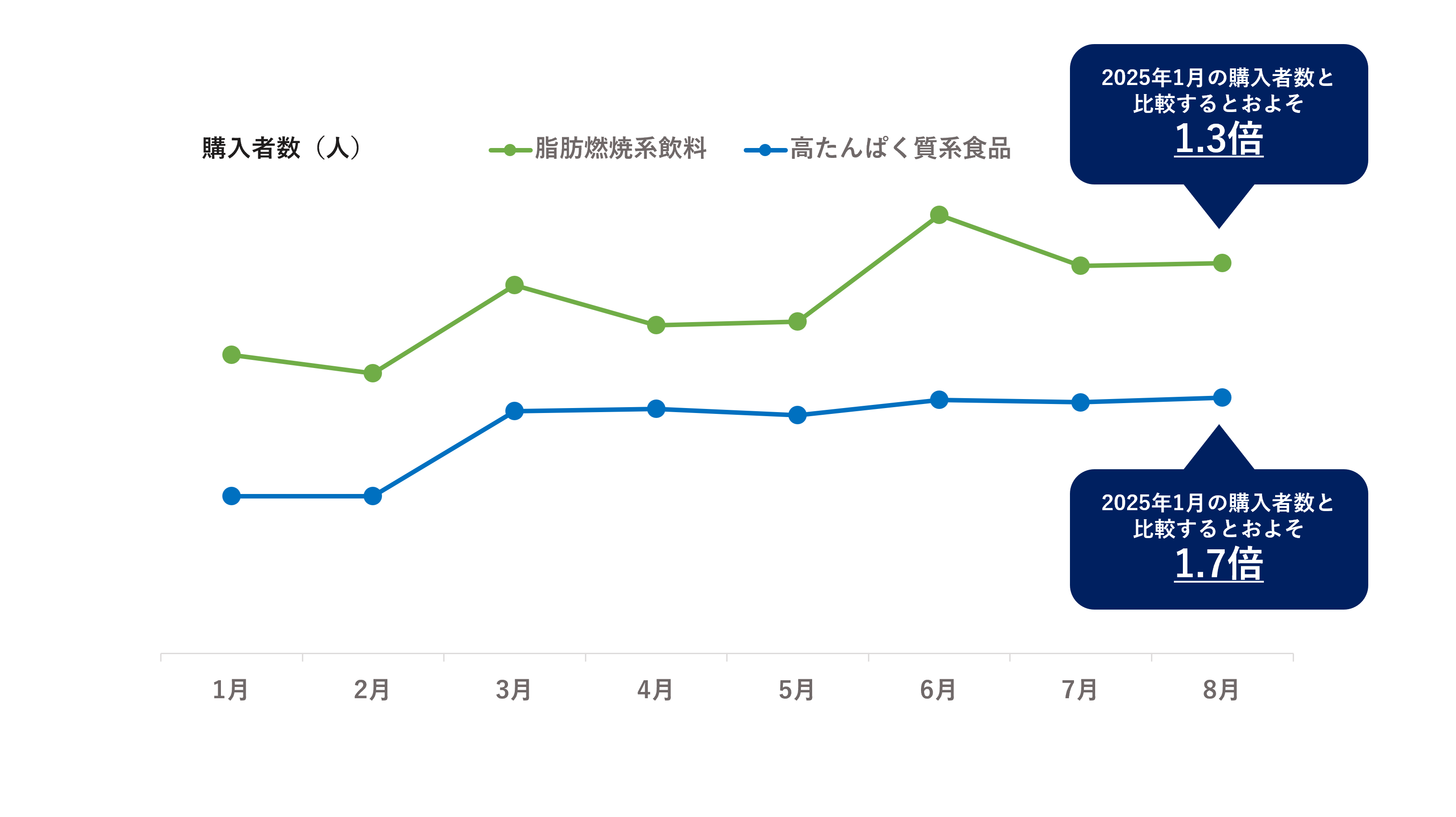 まずは、2025年以降の脂肪燃焼系飲料と高たんぱく質系食品の購入者数を月次推移で表しました。