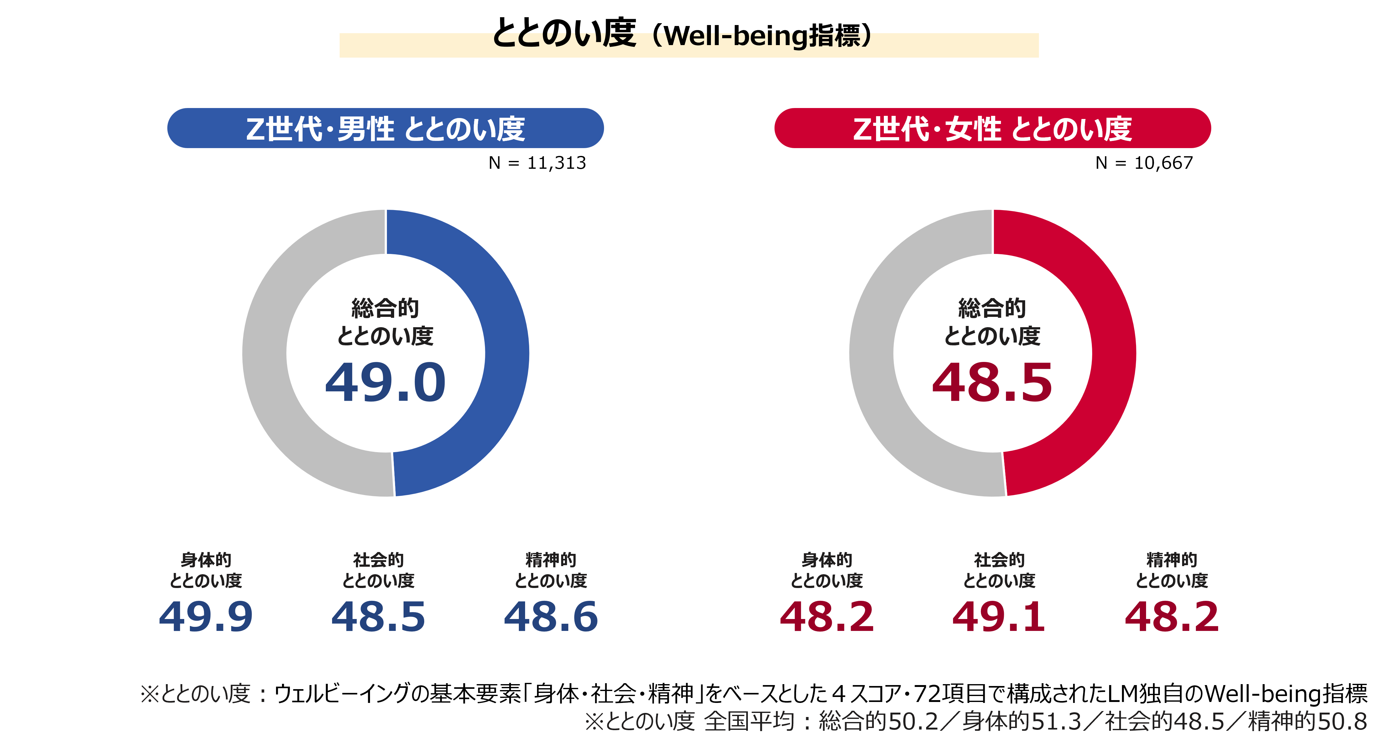 Z世代男性の総合的ととのい度は49.0で、運動・睡眠といった身体的項目が充実している傾向に。一方のZ世代女性の総合的ととのい度は48.5で、周囲との関係性・経済状況といった社会的な項目での充実を感じている。