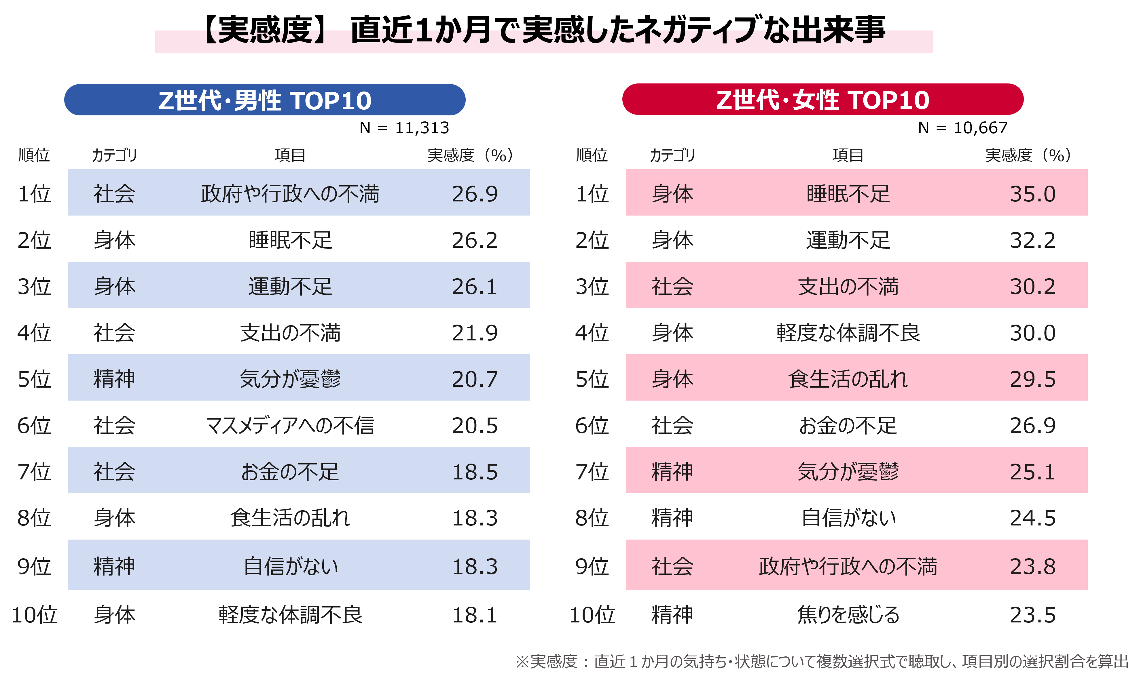 直近1か月で実感したネガティブな出来事については、男性は「政府や行政に関する不満」が26.9%でトップ。また、「マスメディアへの不信」も5人に1人が実感したという結果に。一方の女性は、「睡眠不足」「運動不足」「軽度な体調不良」「食生活の乱れ」といった身体的な不調についての順位が高く、およそ3人に1人が実感している。