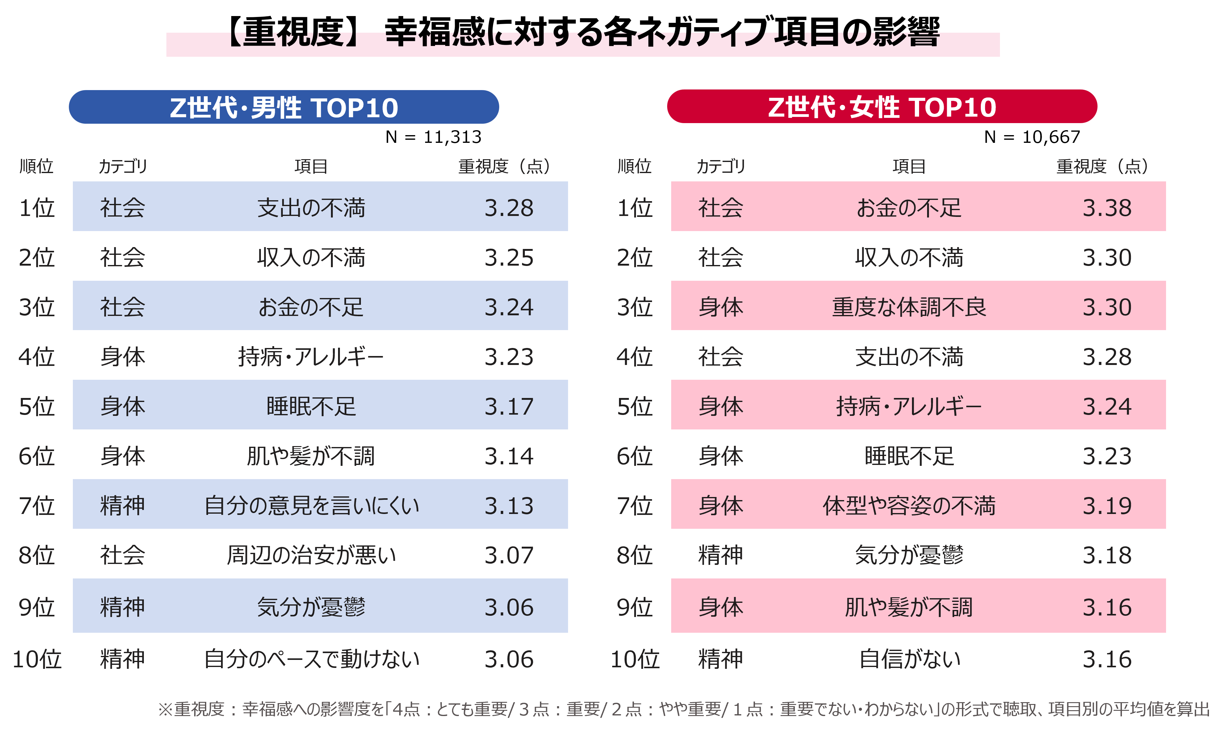 ネガティブ項目では、Z世代の男性は「自分の意見を言いにくい(3.13点)」「周辺の治安が悪い(3.07点)」「自分のペースで動けない(3.06点)」といった、自身の周辺環境に係る項目が幸福感に作用している結果に。一方で、女性は「重度な体調不良(3.30点)」「体型や容姿の不満(3.19点)」「自信がない(3.16点)」といった自身の身体・精神状態に係る不満を重視していることが読み取れる。