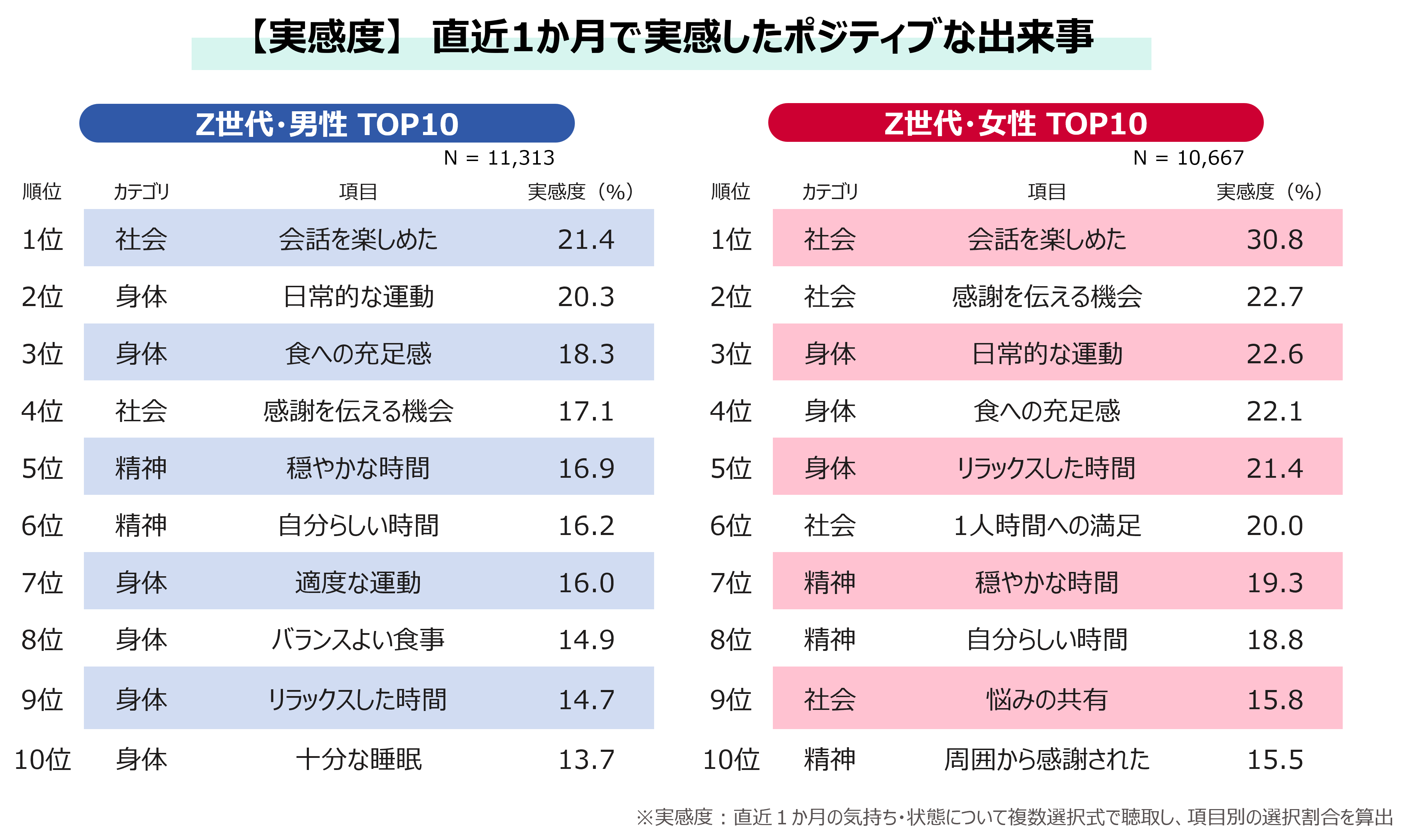 直近1か月間で実感したポジティブな出来事を比較すると、男性は「適度な運動」「バランスのよい食事」「十分な睡眠」といった身体の健康に関連する項目が上位に来る結果に。女性は「1人時間への満足」を5人に1人が実感しているほか、「悩みの共有」「周囲からの感謝」といった周りの人との交流に関する項目がランクイン。