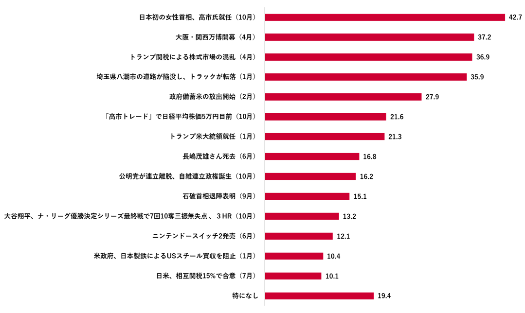 今年特に印象に残っている出来事は、「日本初の女性首相、高市氏就任」が42.7%でトップ、次いで「大阪・関西万博開幕」が37.2%、「トランプ関税による株式市場の混乱」が36.9%で上位だった。