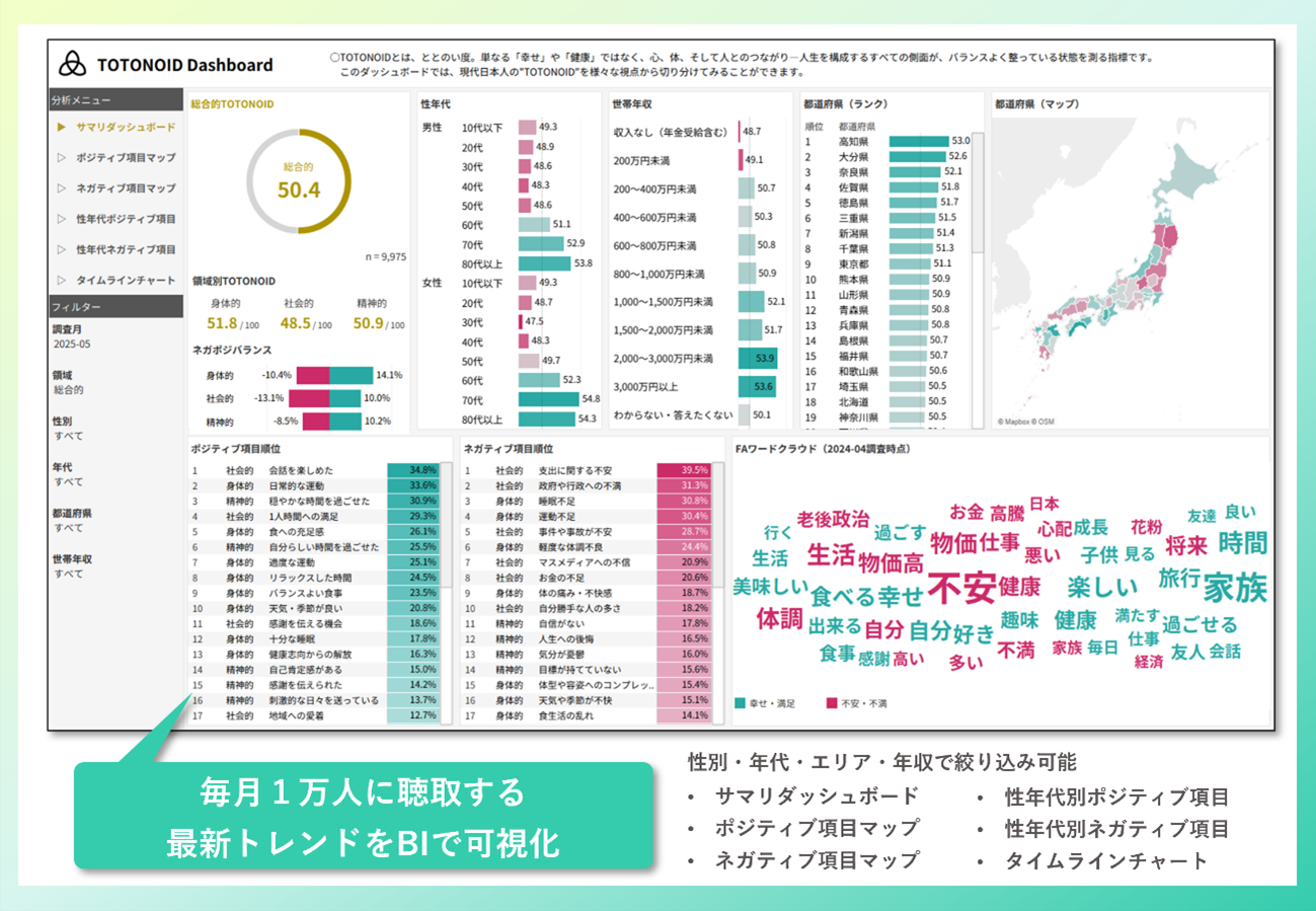 全72項目の実感度と重視度から回答者自身のウェルビーイング状況を把握するLM独自の指標。ウェルビーイング発想のマーケティングサービス『TOTONOID(ととのい度)』として2025年7月31日に提供を開始した。毎月1万人にアンケートを聴取し、日々移り変わる生活者ウェルビーイングのトレンドを調査。調査結果はBIツールで可視化し、無料で公開している。