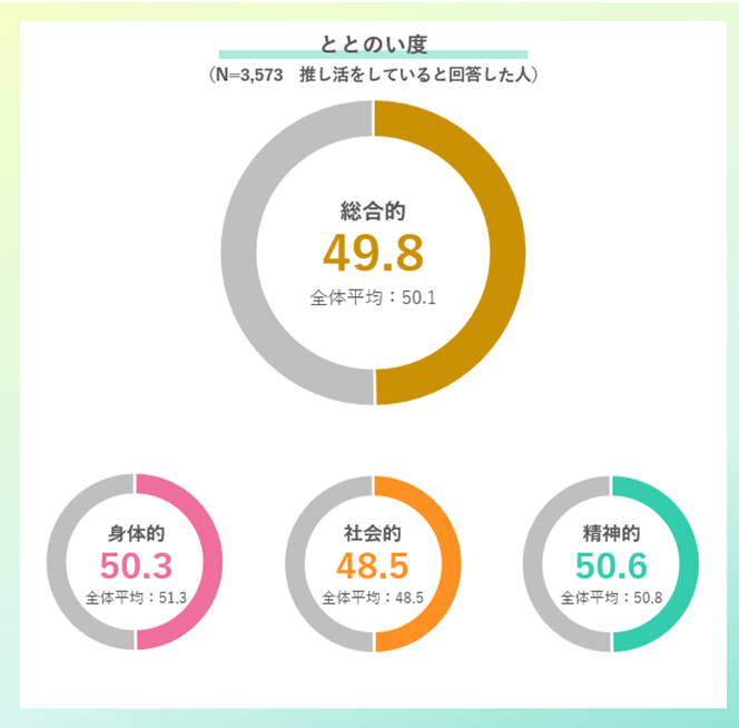 推し活をしている人を対象に、幸福度を表す「ととのい度*」を算出し、全体との比較を行った。精神的ととのい度、身体的ととのい度、社会的ととのい度、さらに3つの総合的ととのい度をそれぞれ算出した。推し活をしている人の総合的ととのい度は49.8点で、推し活をしていない人を含む全体平均の50.1点に近い点数となった。要素別の3つのととのい度を見ると、精神的ととのい度が最も高く50.6点だった。次いで、身体的ととのい度が50.3点、社会的ととのい度が48.5点だった。精神的・身体的ととのい度は全体平均よりも低く、社会的ととのい度は全体平均と同じ点数となった。