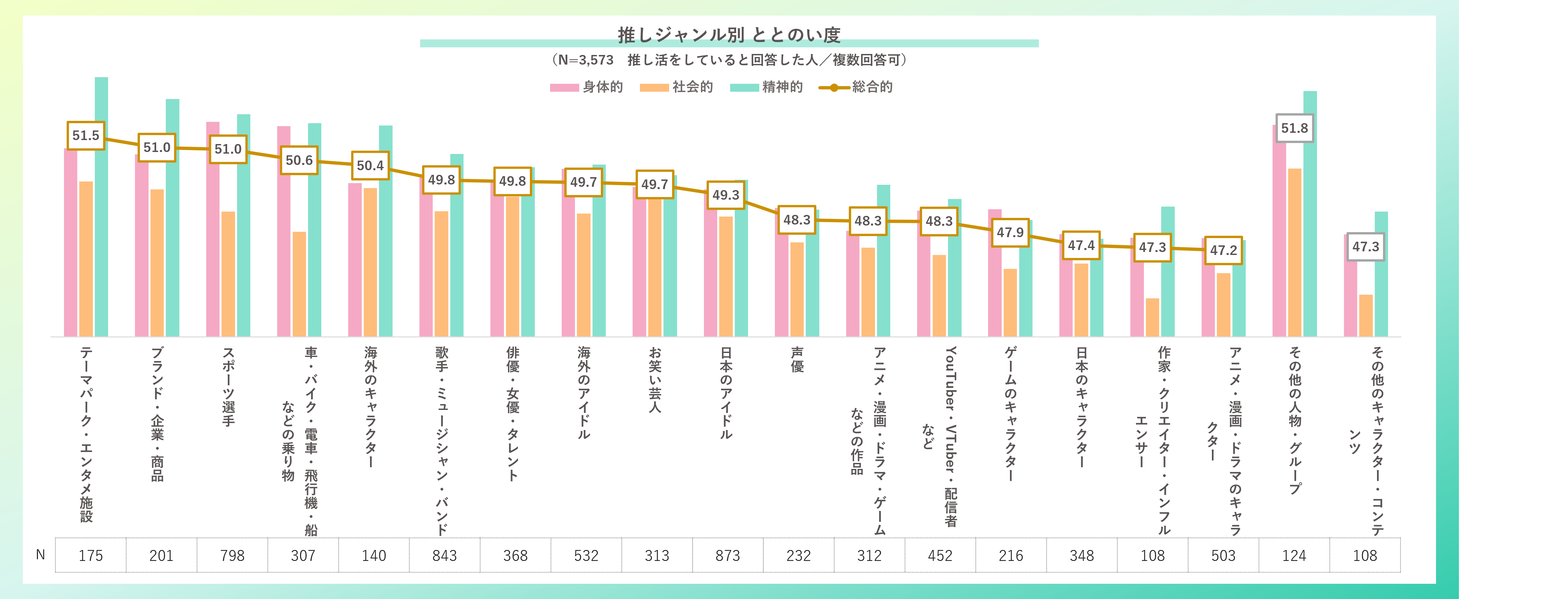 推しているジャンル別に総合的ととのい度を比較すると、「テーマパーク・エンタメ施設」を推している人が最も高く、51.5点となった。「スポーツ選手」推しと「乗り物」推しは、他のジャンルと比較し、身体的ととのい度が高くなる傾向が見られ、それぞれ52.0点、51.8点となった。