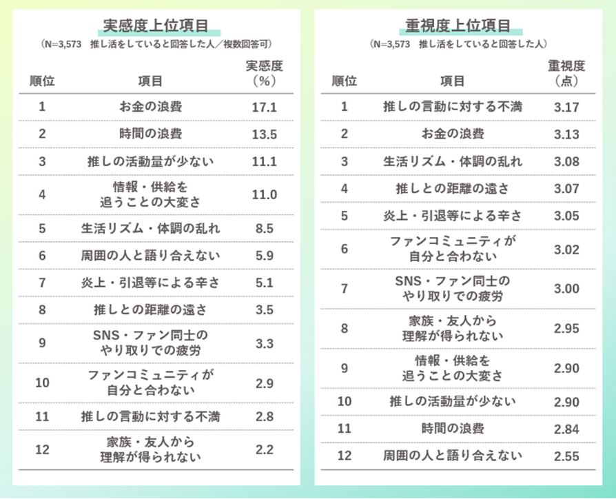 推し活をしている人に、直近1カ月以内に推し活を通じて実感したネガティブなことを聴取した。1位は「お金の浪費」(17.1%)、次いで「時間の浪費」(13.5%)となった。