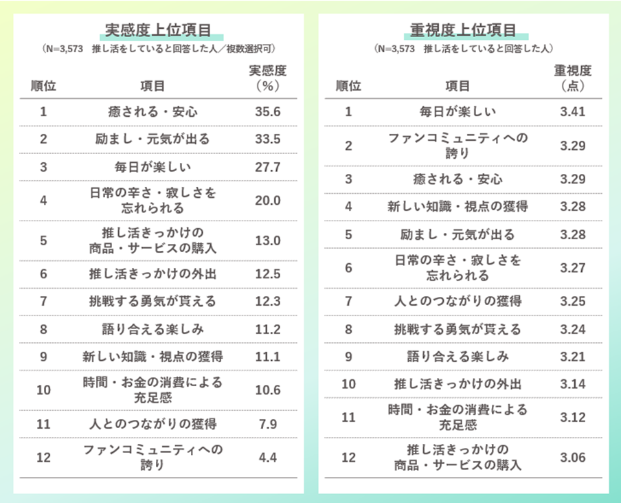 推し活で感じたポジティブなことは「癒される・安心」の回答が35.6%と最も多く、幸福度を高める出来事として最も重視されているのは「毎日が楽しい」。