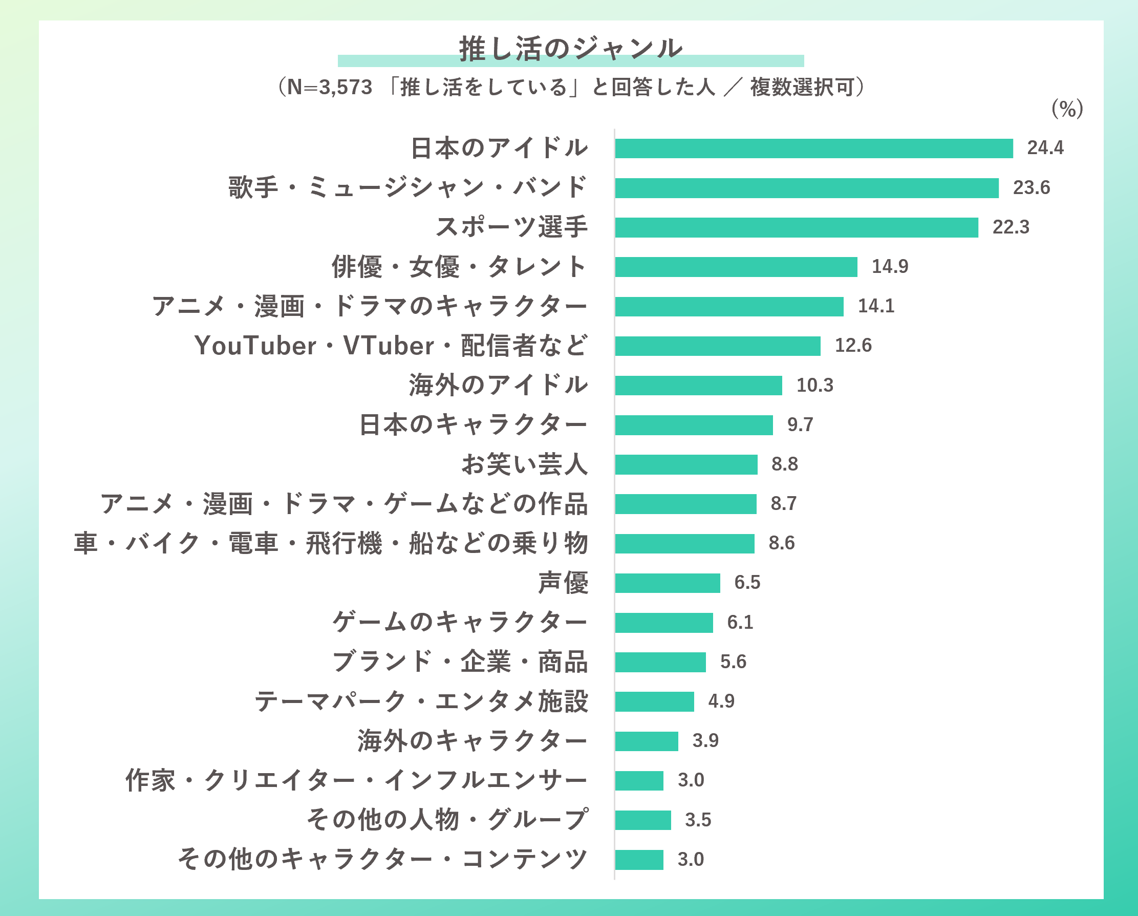 推しのジャンルは、「日本のアイドル」の回答が24.4%と最も多く、次いで、「歌手・ミュージシャン」が23.6%、「スポーツ選手」が22.3%だった。